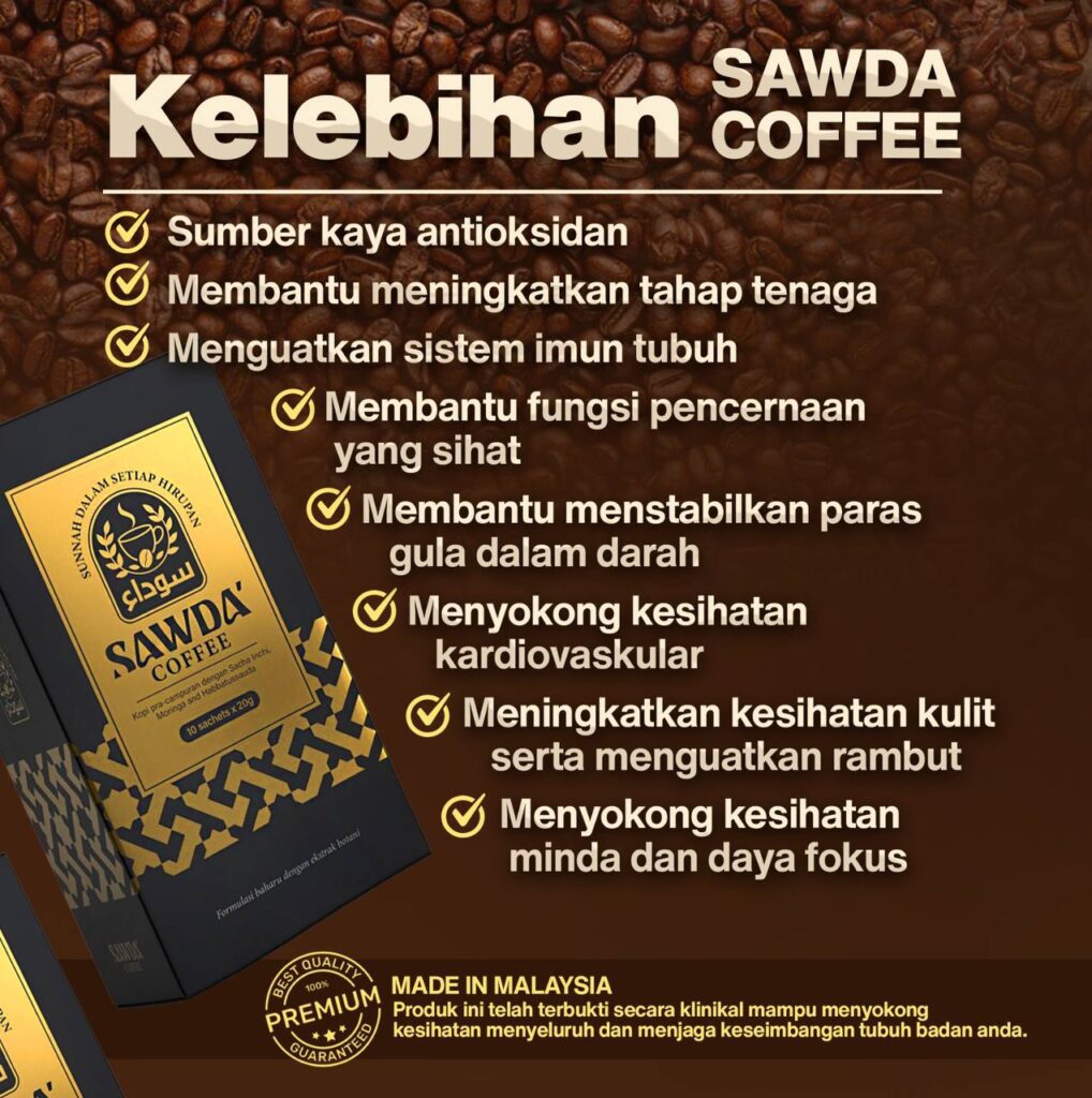 Kopi SAWDA adalah minuman kopi yang diperkaya dengan ekstrak moringa, sacha inchi dan habbatussauda yang terkenal dengan pelbagai manfaat kesihatan. Ia membantu meningkatkan tenaga dan menyokong sistem imun badan.