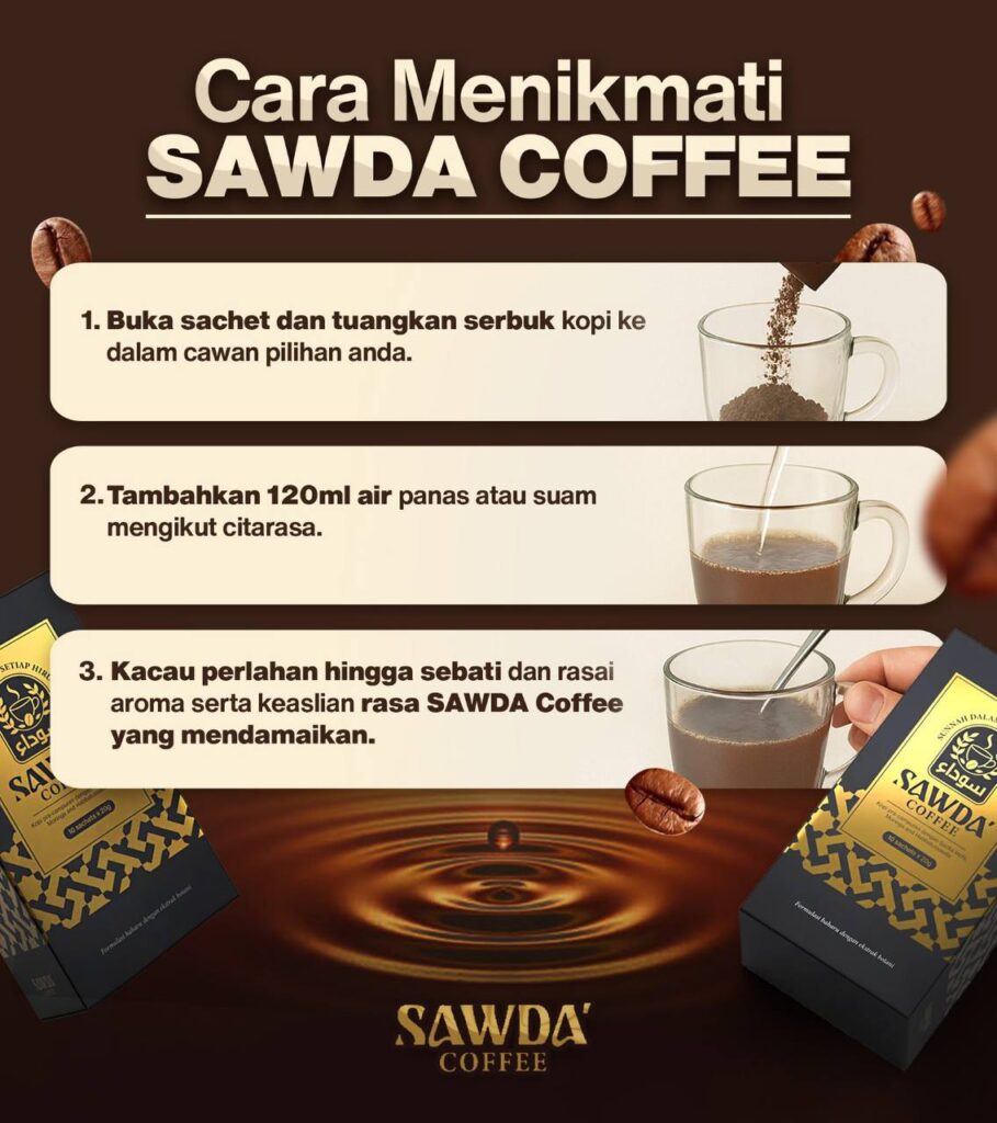 Untuk menyediakan Kopi SAWDA, hanya campurkan 1 sachet dengan 150ml air panas atau sejuk. Kacau sehingga larut dan nikmati!